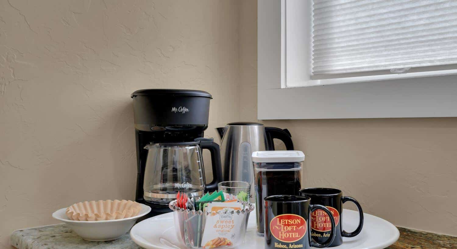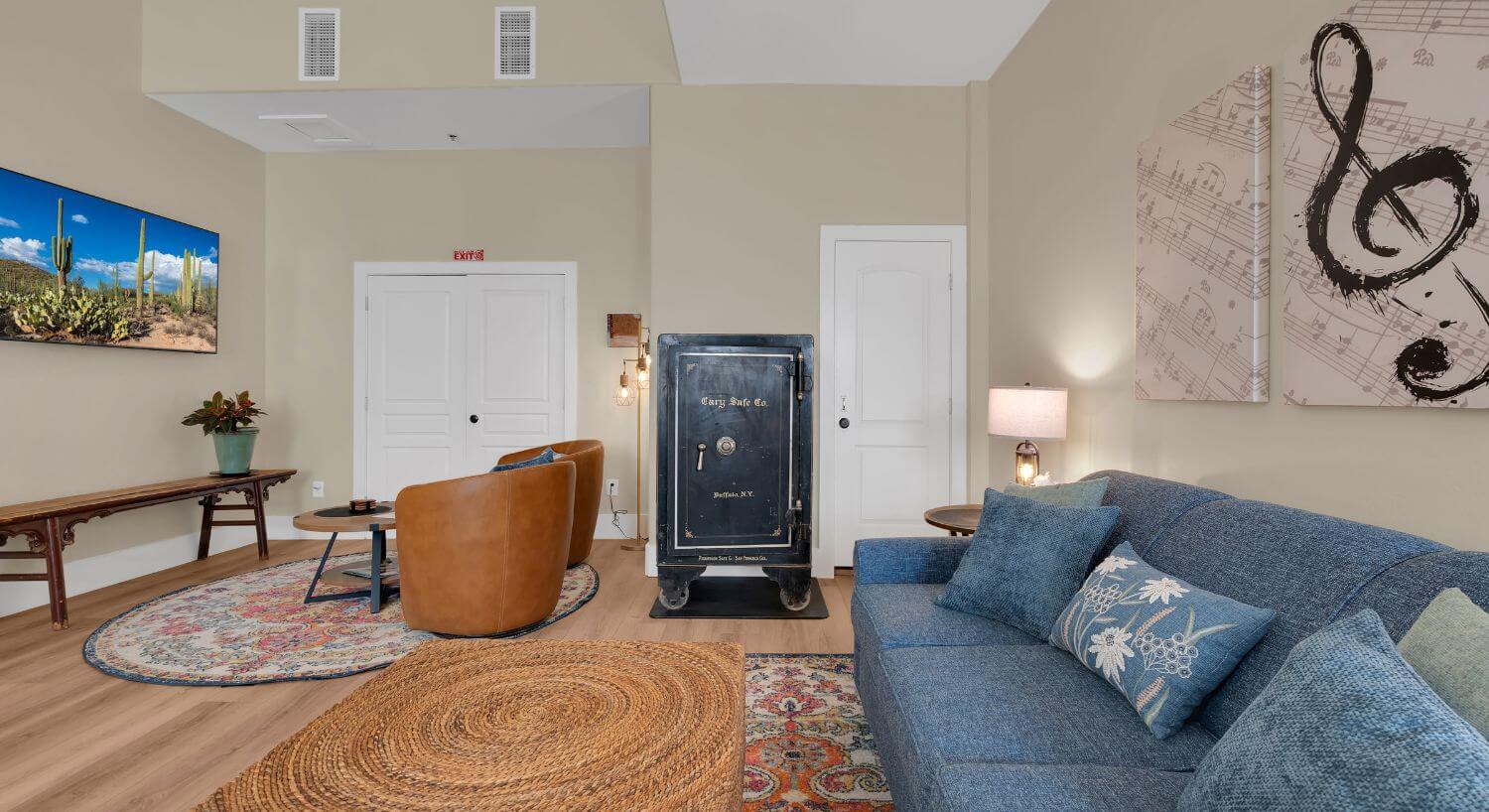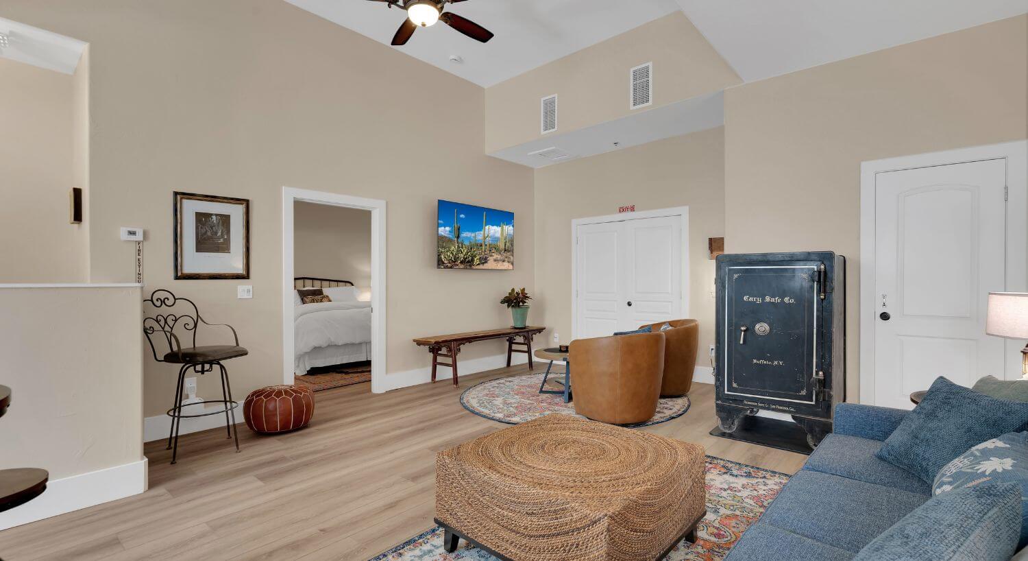 Suite 25 is a large two-room suite located on the ground floor of Letson Loft Hotel, perfect for vacations or weekend getaways to Southern Arizona. The bedroom features two luxurious queen-size beds with Letson’s signature Presidential Series pillow-top mattresses, 300-count 100% cotton sheets, down comforters, and pillows. Windows in both the bedroom and sitting room look out onto Commerce Street. Room Seven can accommodate up to four people, with a $25 additional charge per person for third/fourth persons. All guest rooms feature hardwood floors, designer area rugs, 11’ ceilings with crown molding, ceiling fans, and/or skylights. Other Amenities: Private full bath with a deep claw-foot tub and shower combination Individually controlled heat and air-conditioning system 40” HD TV with cable Hair dryer Iron & ironing board Free in-room high-speed wireless Internet access Keyless security entry All rooms include a continental breakfast, sunroom relaxation area, and downstairs guest lounge with utility kitchen, microwave, and refrigerator (no cooking appliances).