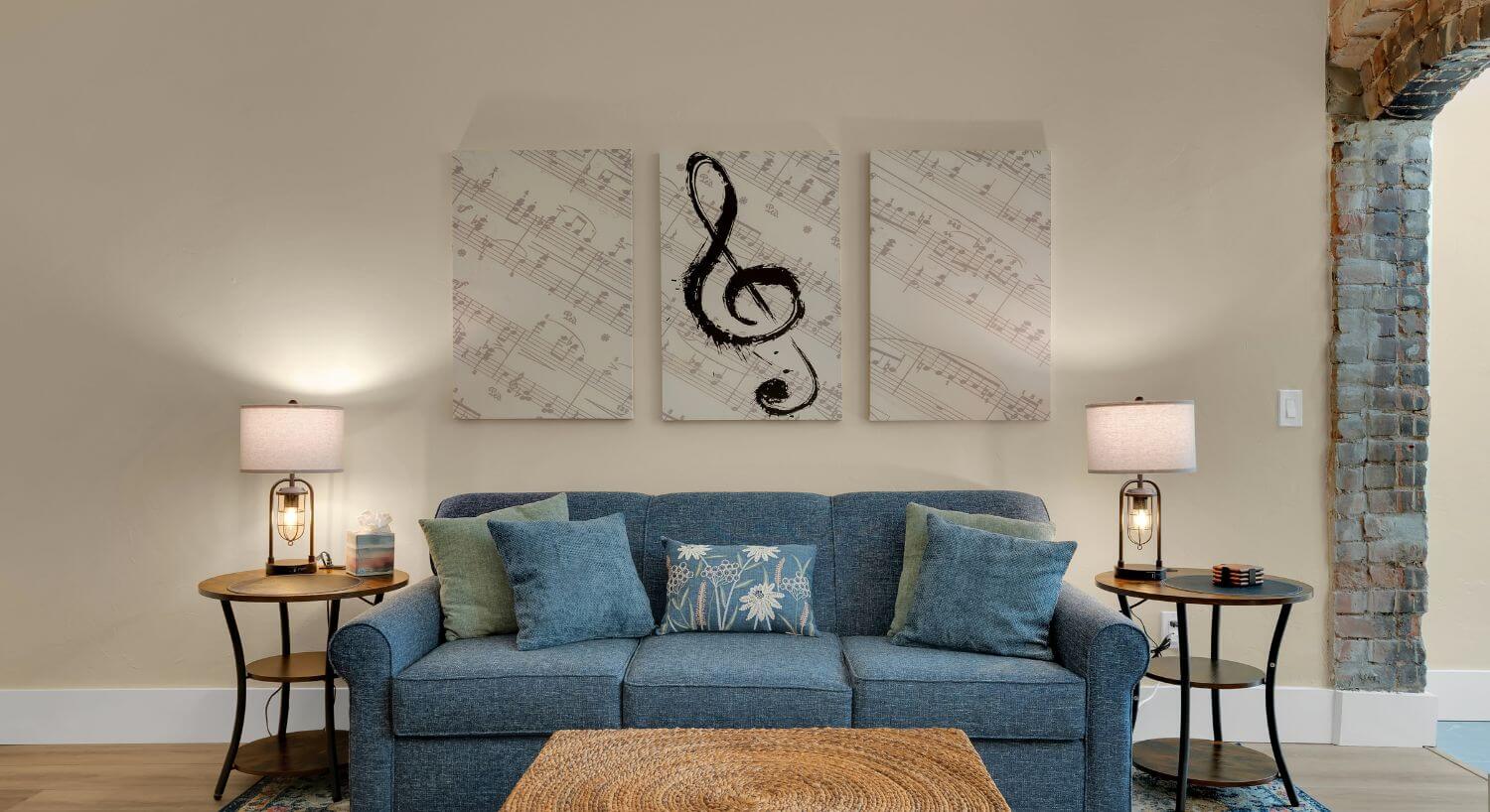 view of living room with blue couch, leather chairs, artwork on wall, kitchenette with round table and stools, narrow domed doorway opening